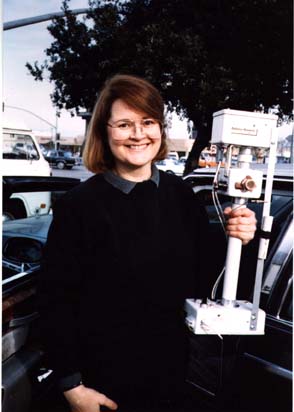 Photo of Mary holding a nephelometer, the instrument for reading particulate levels.