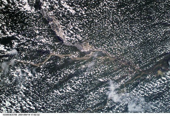 Caption for Item 2: This is a photograph collected by an astronaut aboard the International Space Station on September 14, 2001. The scene shows the sky filled with cumulus clouds over a large region in north central Brazil. A portion of the Amazon River is visible in this scene. Credit: NASA