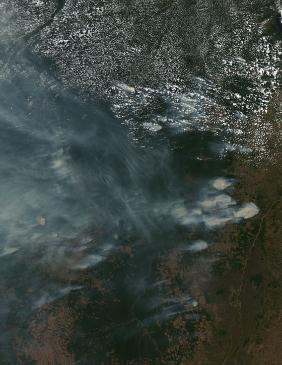 Caption for Item 1: This image is a true-color image acquired over Amazonia on August 11, 2002, by the Moderate Resolution Imaging Spectroradiometer (MODIS) aboard NASA's Aqua satellite. Heavy smoke (gray pixels) from biomass burning fills the center and left portions of the scene while the scene is dominated by cumulus clouds toward the top and right. Note that where there is heavy smoke, no cumulus clouds are forming. Credit: NASA