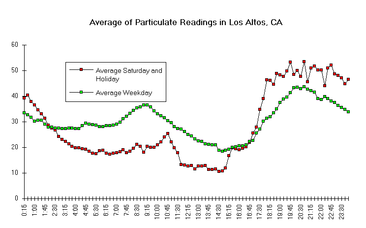 ![]() The vertical numbers on the left show the density of particles that are smaller than 2.5. The horizontal numbers are the 15-minute time averages through out the day. Take your finger and follow the green line to see how the pollution builds up at night. When you follow the red line for the weekend, you see the traffic bulge isn't there in the morning, but by 5:30 PM (17:30) the red line rises from the lowest level of the week to the highest level of the week, on the chart. The highest pollution occurs at late night around 11 PM. Weekends are higher than weekdays. Here we see time-average curves which are compiled by taking the data collected over a period of about 3 months in the winter of 1992-93 and then separating the data into weekdays and Sundays-holidays. The averages each time period was generated for weekdays and days that were Sundays or holidays and were plotted in the graph. The most striking feature from this data is that the shape of the two curves were very similar. This indicates that the particulate production could not have been importantly influenced by traffic. There are no important rush hour peaks on the week ends such as would be expected on weekdays (Ott). Also the magnitude of the evening peak is in the Sunday-holiday curve suggesting a recreational activity such as sitting in front of a fire. Notice how the evening peak is later on weekdays indicating how the activity waits until after people arrive home. from Conference Presentation